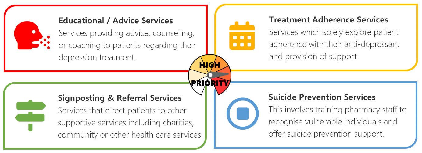59 stakeholders from across the UK participated in a 2-part consensus questionnaire. Participants were presented with the five types of services and asked to rank the services by priority. They also had the opportunity to propose new ideas for community pharmacy depression services. A total of 4 services were identified as a ‘High Priority’.